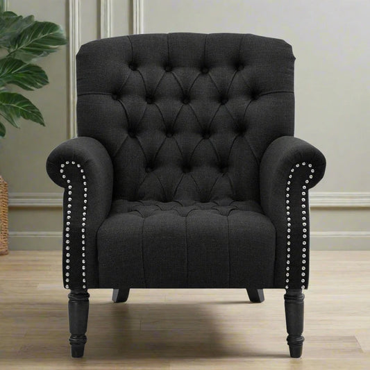 Maurice Charcoal Linen Buttoned Armchair With Studs.