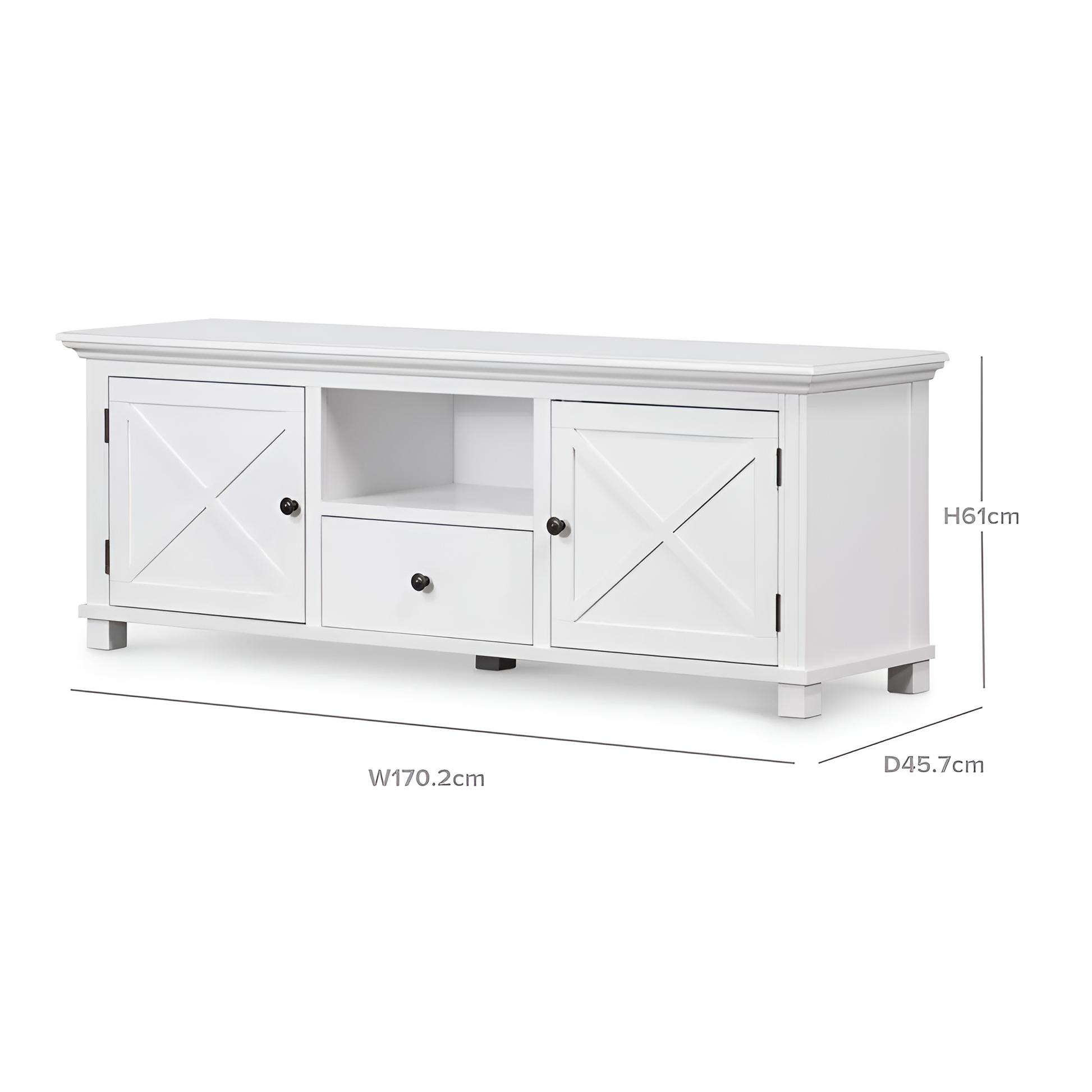 Measuring at 170 cm, this versatile piece is ideal for supporting your TV and media or displaying decor, or storing essentials. Whether your home overlooks the ocean or you're dreaming of seaside vibes, this entertainment unit will anchor your room with timeless Hamptons style.