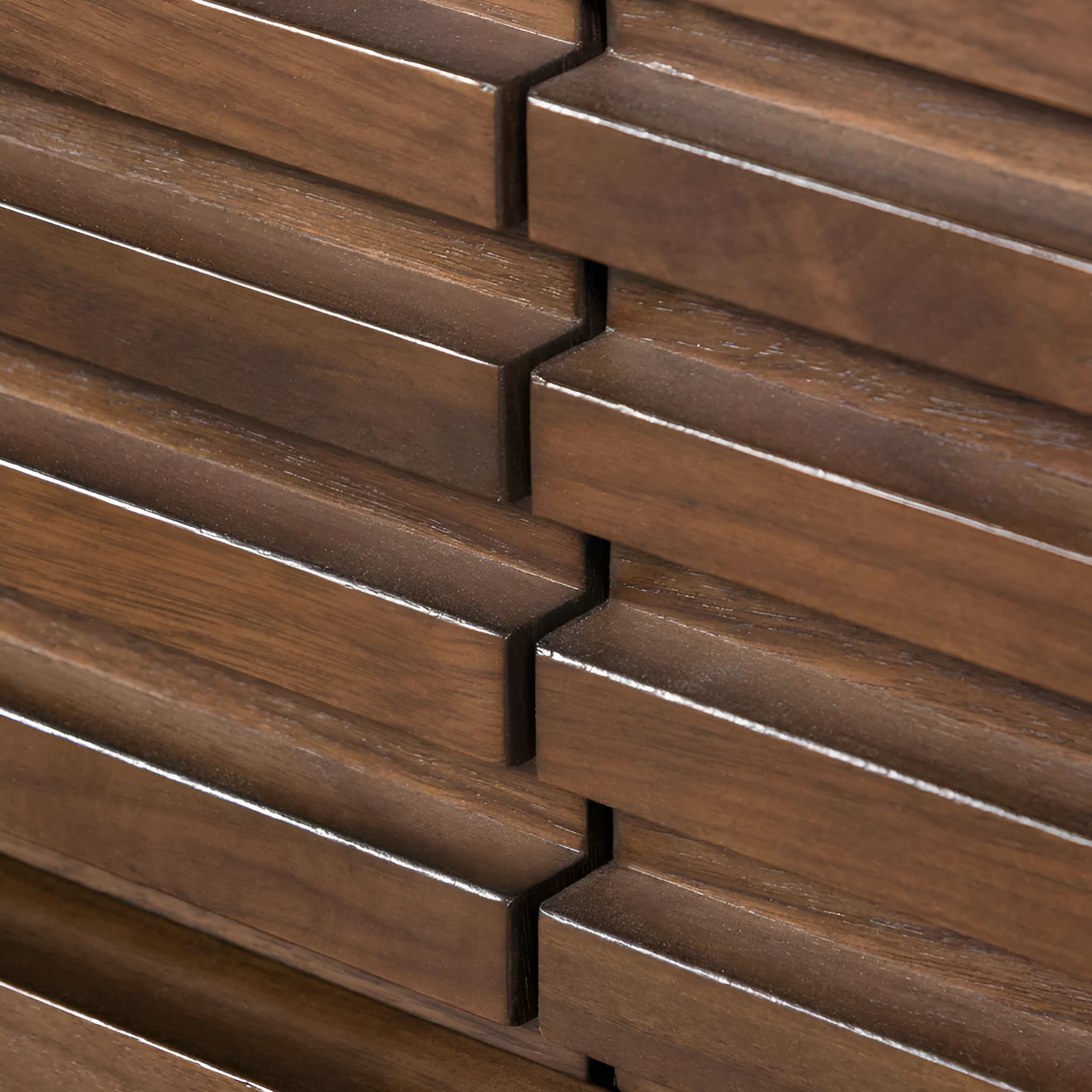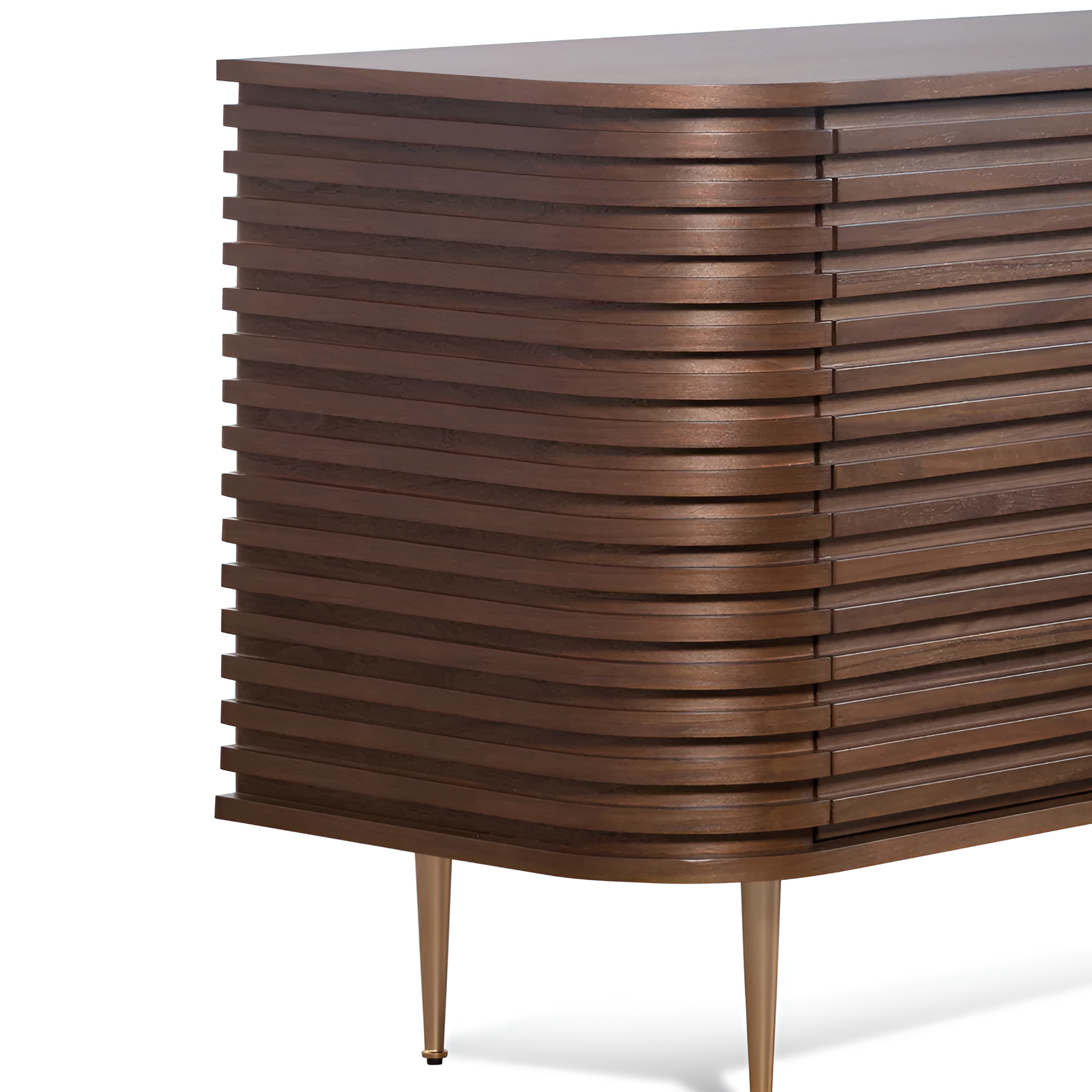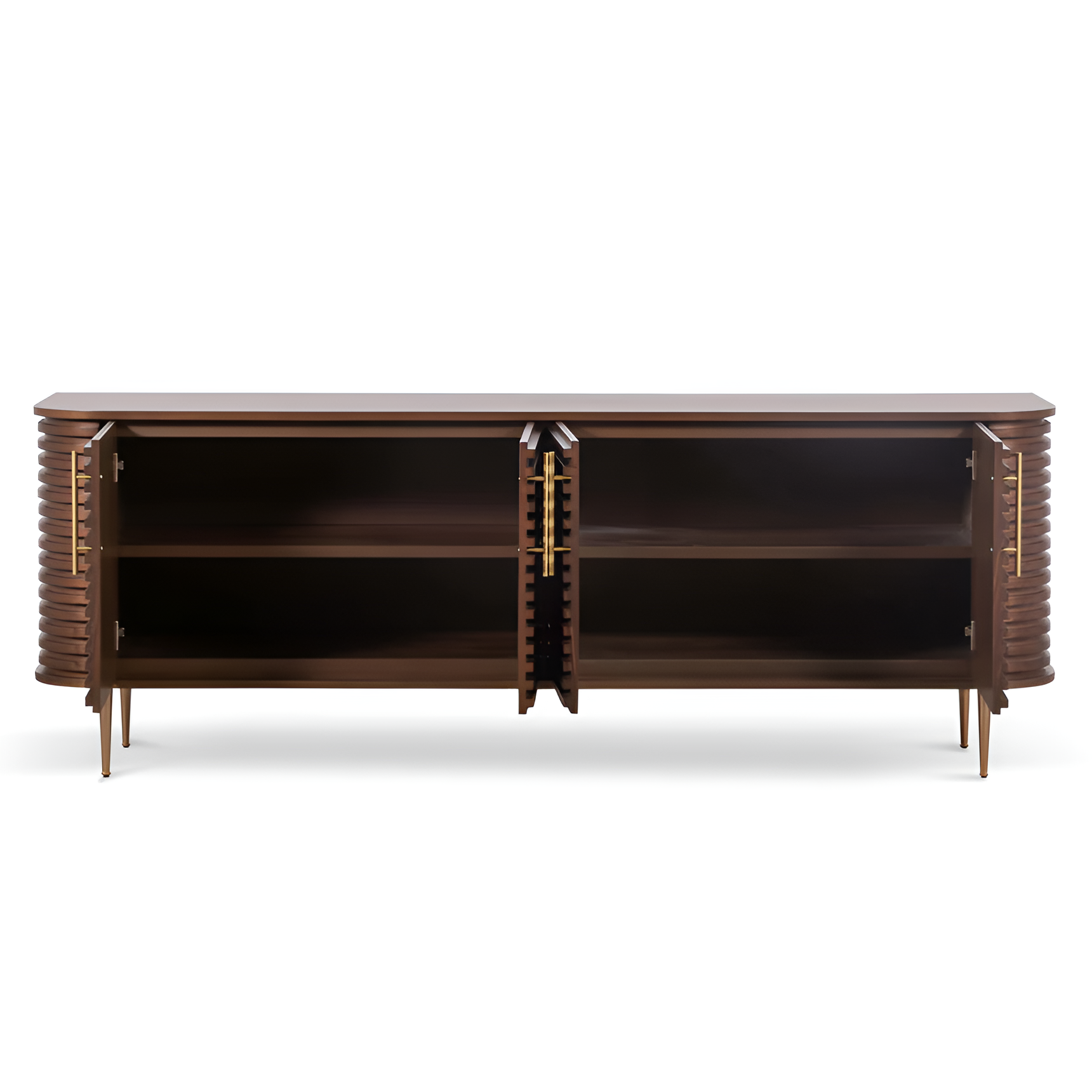 Introduce a touch of warmth and elegance to your home with our stunning walnut oak veneer buffet. Crafted from high-quality engineered wood and finished with a rich walnut oak veneer, this fluted buffet unit exudes sophistication and timeless charm. The beautiful wood grain is accentuated by the piece's rounded edges and complemented by the brushed gold finish of the metal handles and base, adding a luxurious touch to your space. With four push-to-open doors that reveal concealed shelves, this buffet offers ample storage for your dinnerware, serveware, or other household items, keeping your living area organized and clutter-free. The perfect blend of functionality and style, this walnut oak veneer buffet is a versatile addition to any dining room, living room, or entryway, effortlessly elevating your interior design. Minor assembly is required to attach the legs and handles, ensuring a simple and straightforward setup process.